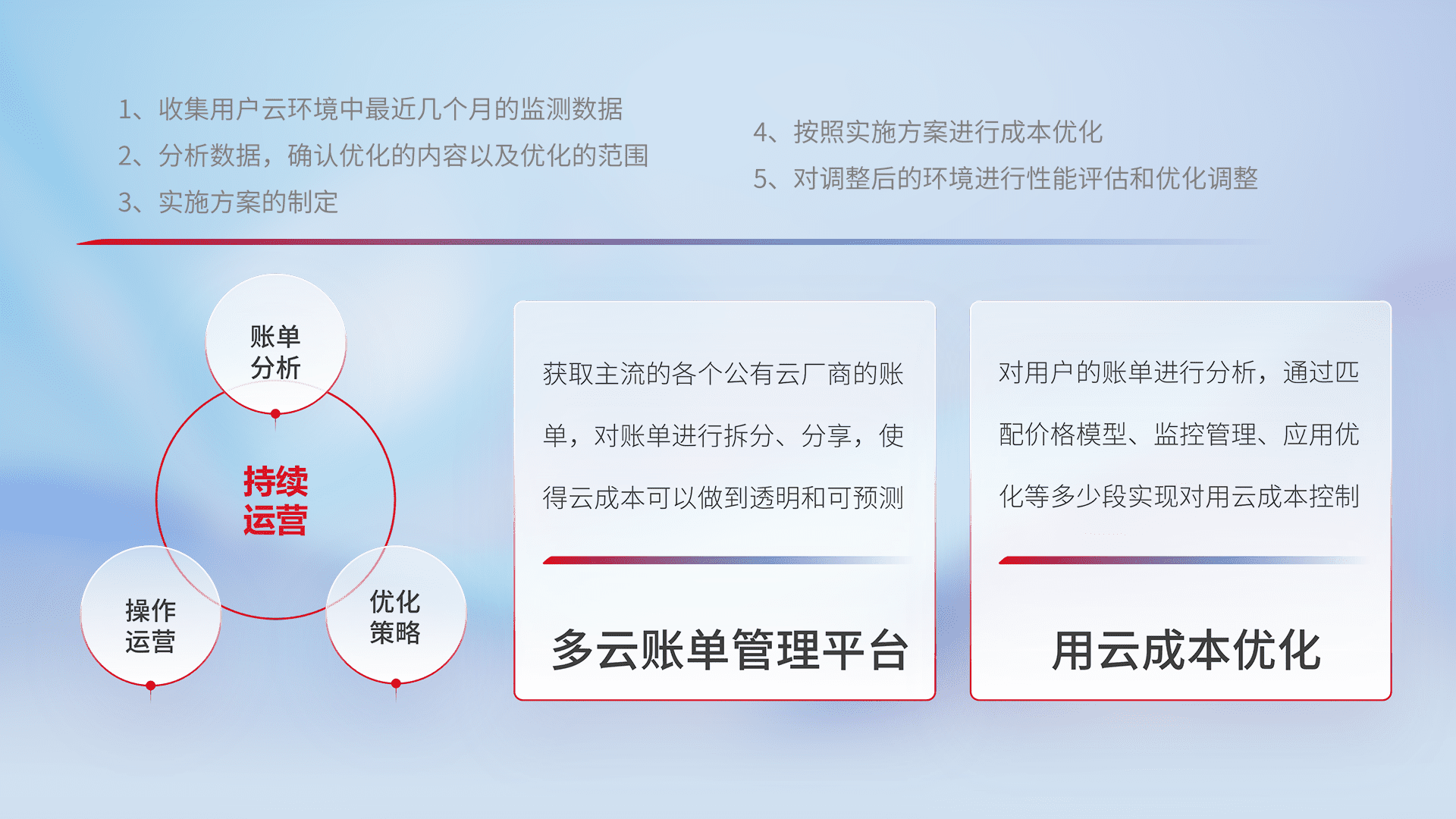 通过多云纳管,,以统一的资源数据模型把客户的云资源进行抽象和封装,,,进而实现对多云资源的统一操作,,,保障云资源管理的可靠性、、稳定性与可用性。。。。量身定制化运维内容,,,配置、、、开发运维、、、、补丁管理、、备份、、、、监控、、、认证和访问管理、、、审计和日常巡检等,,,,保障在用云过程中的可靠度,,,,稳定度以及高可用率。。